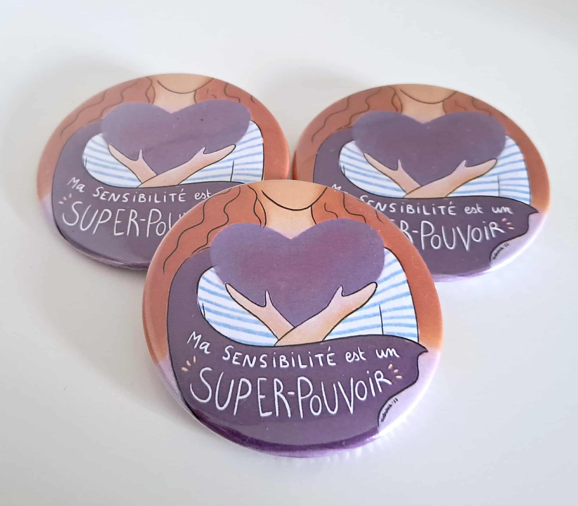 Affirmez votre personnalité avec style grâce à ces badges illustrés ornés de la citation inspirante : "Ma sensibilité est un super-pouvoir".