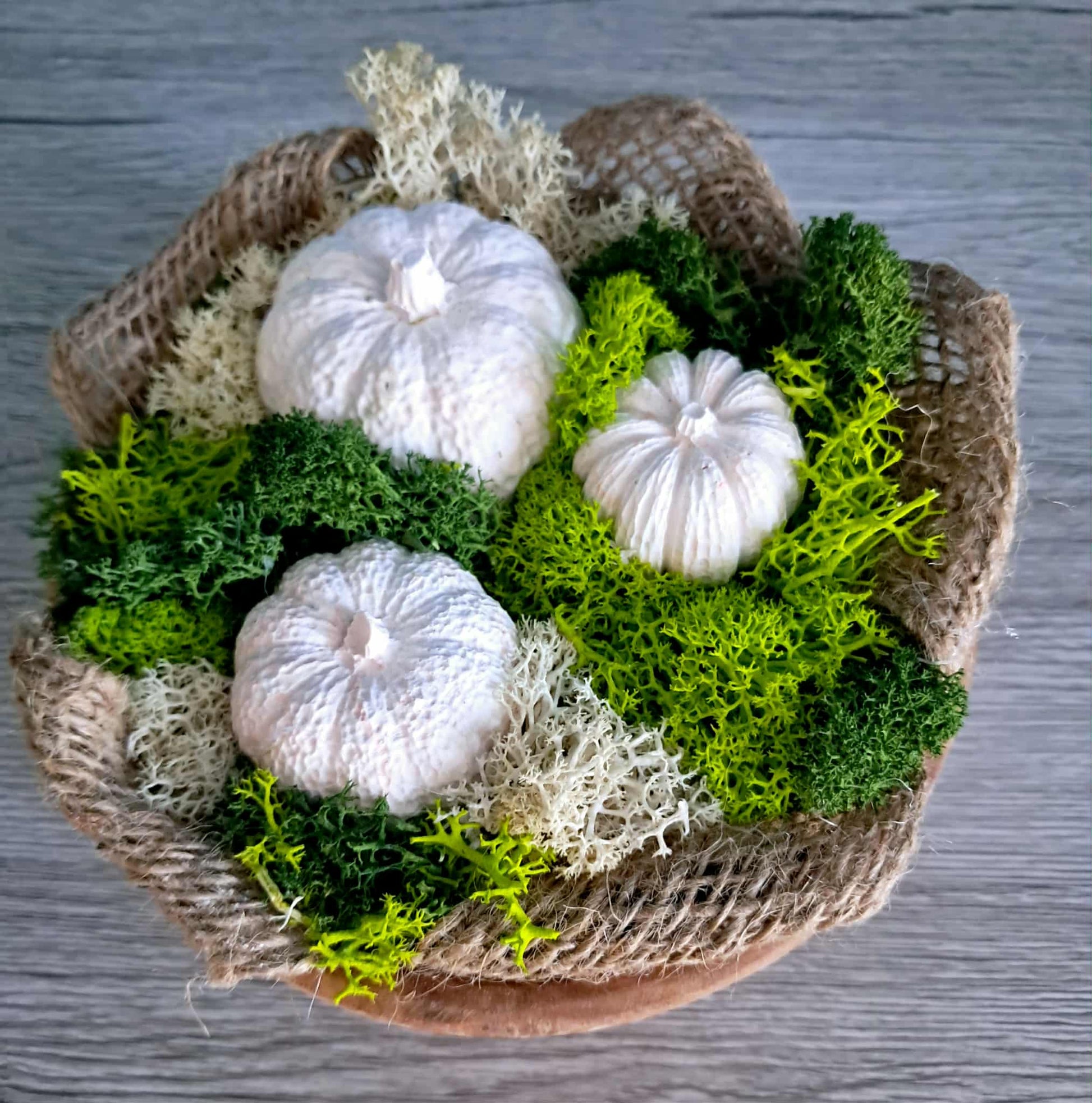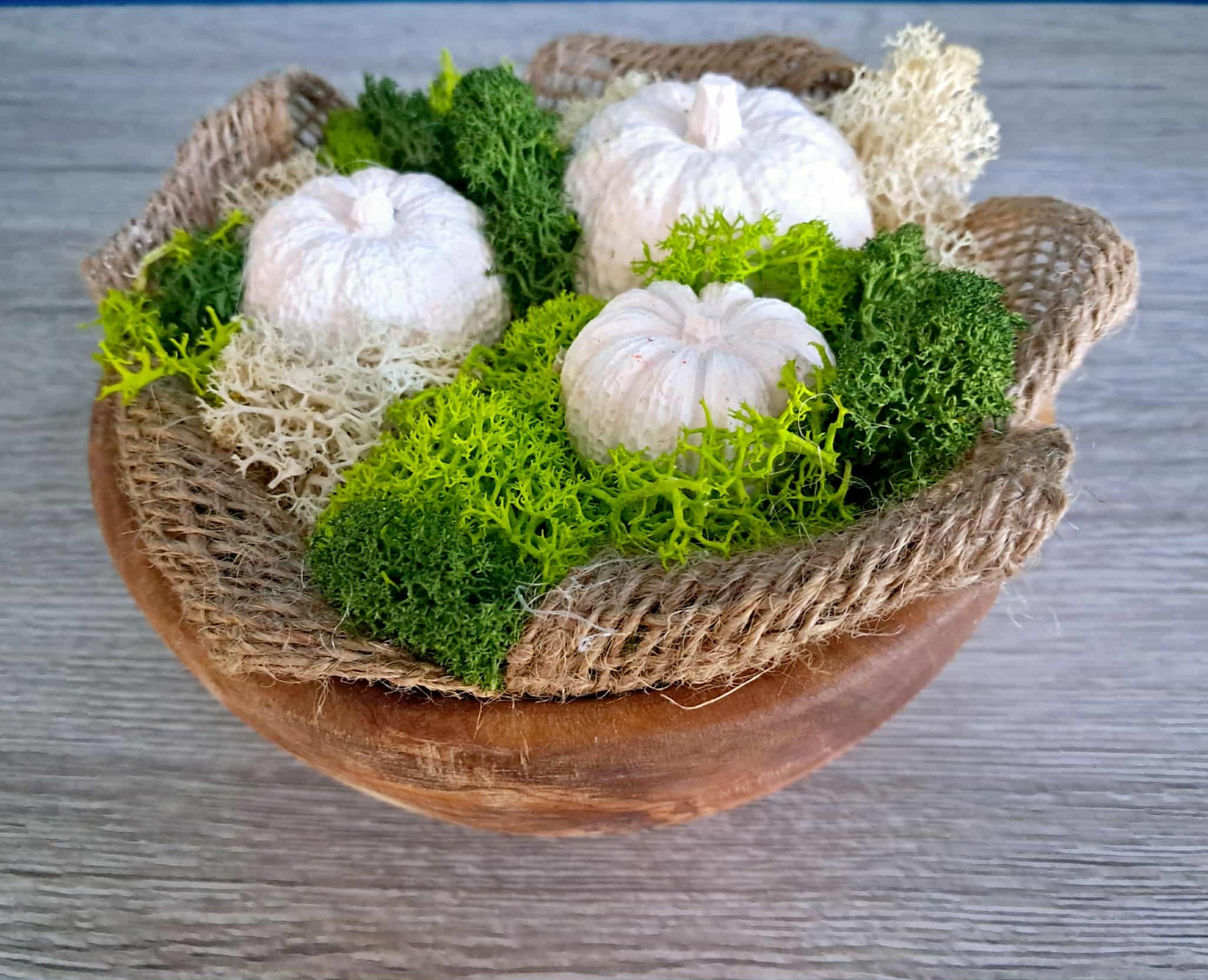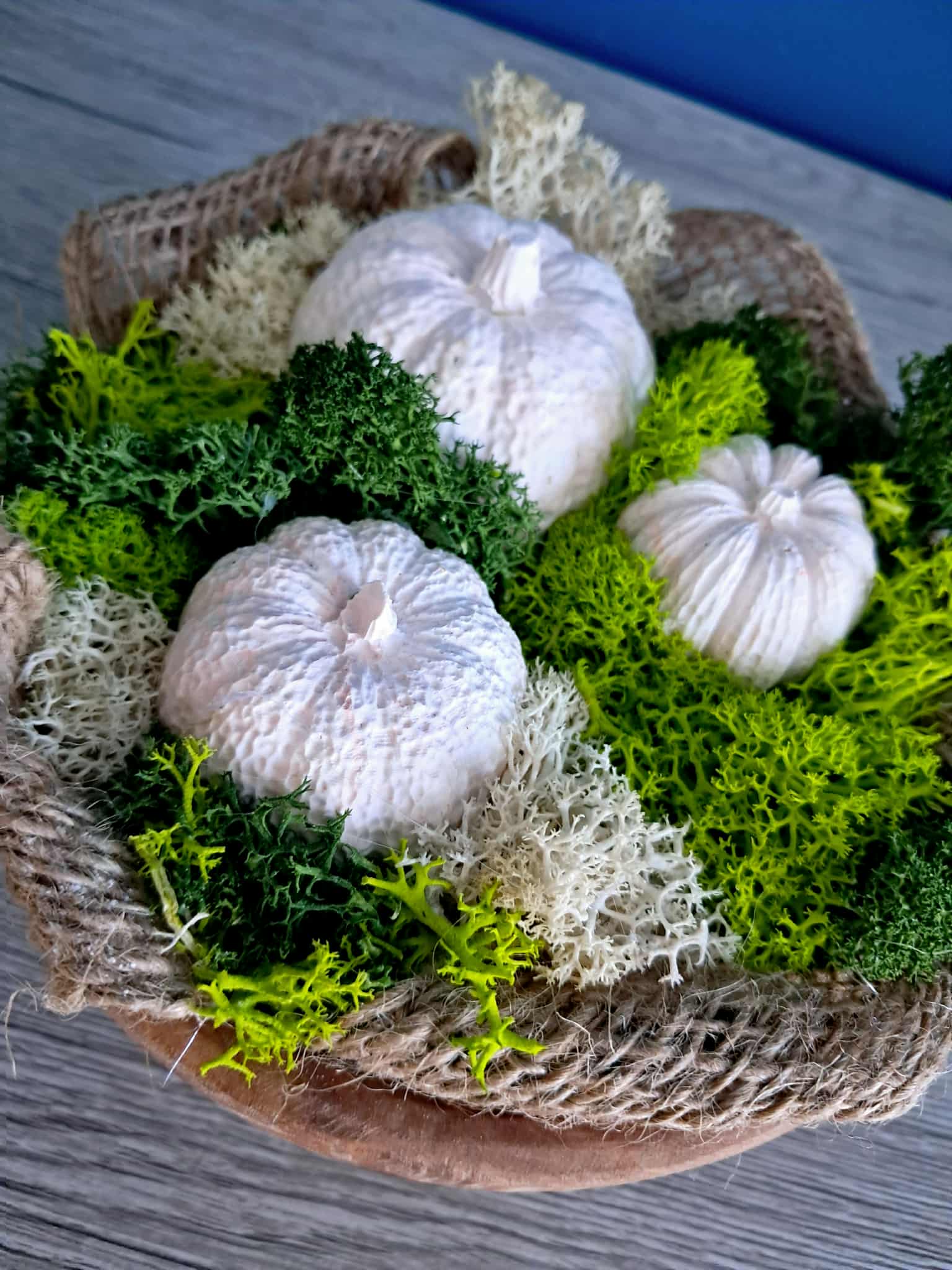 De délicates citrouilles en porcelaine blanche sont disposées dans un superbe bol en bois d’olivier alliant douceur et authenticité.