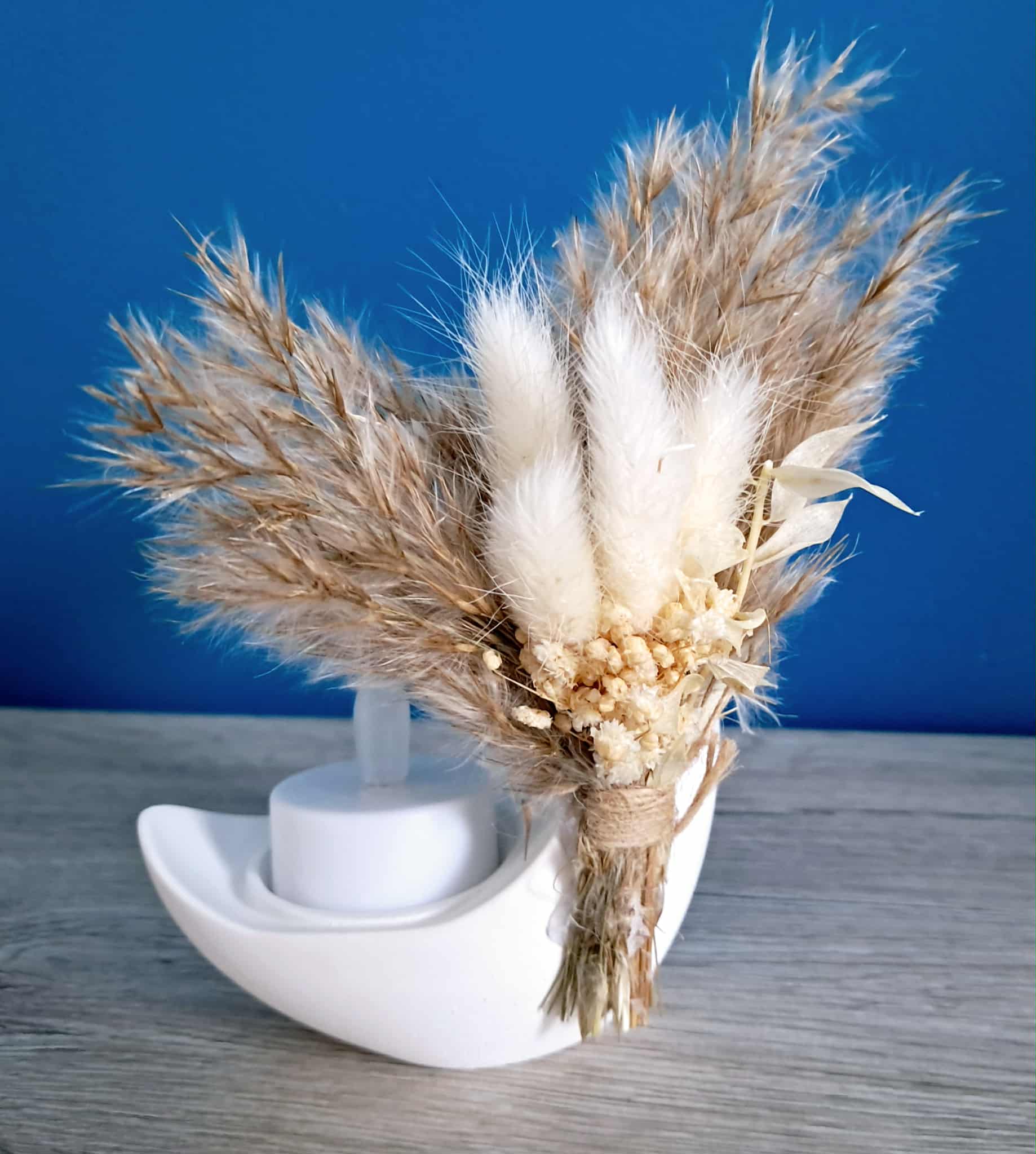 Un bouquet de mini fleurs séchées complète la composition en apportant une touche naturelle à la composition.