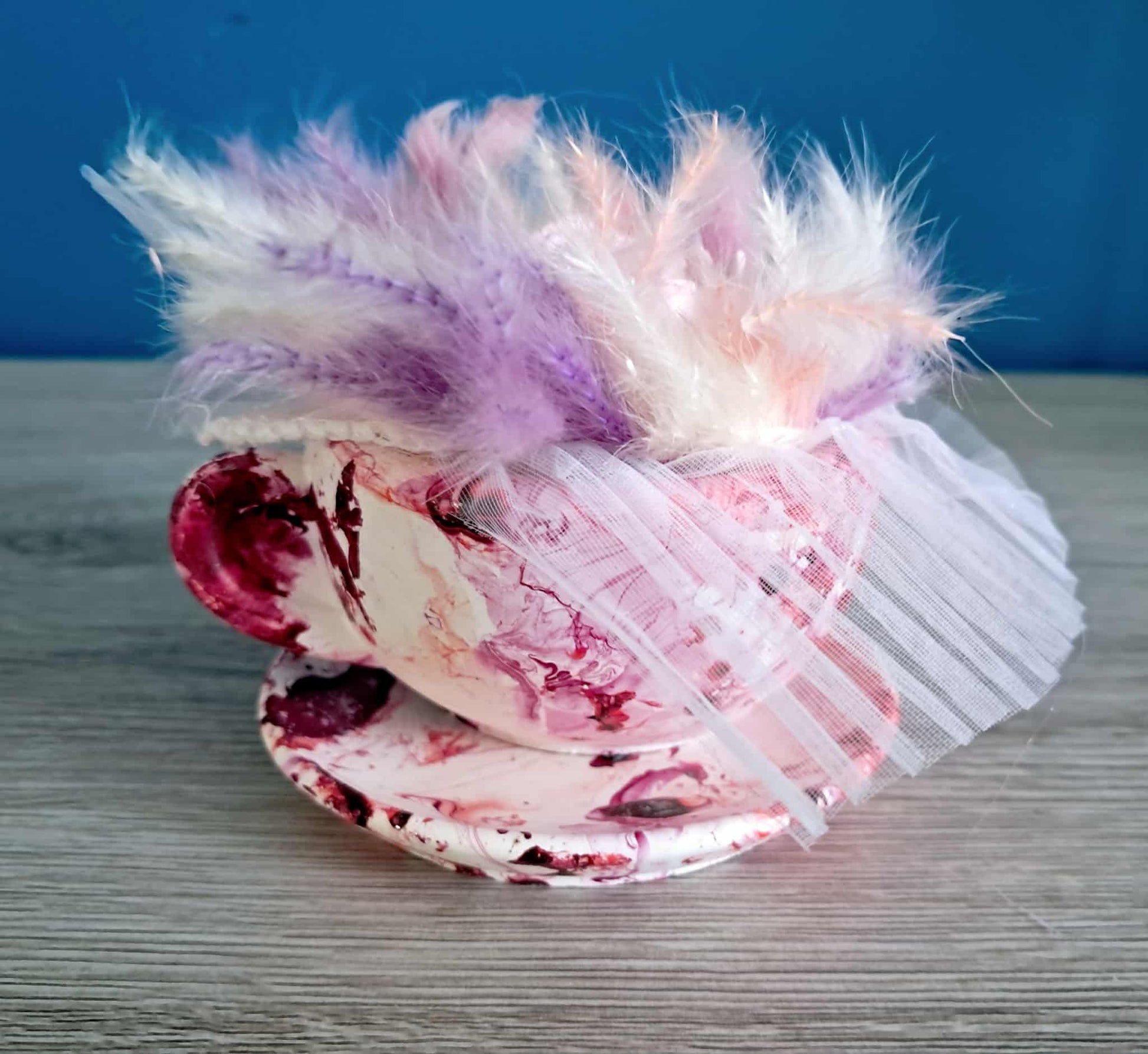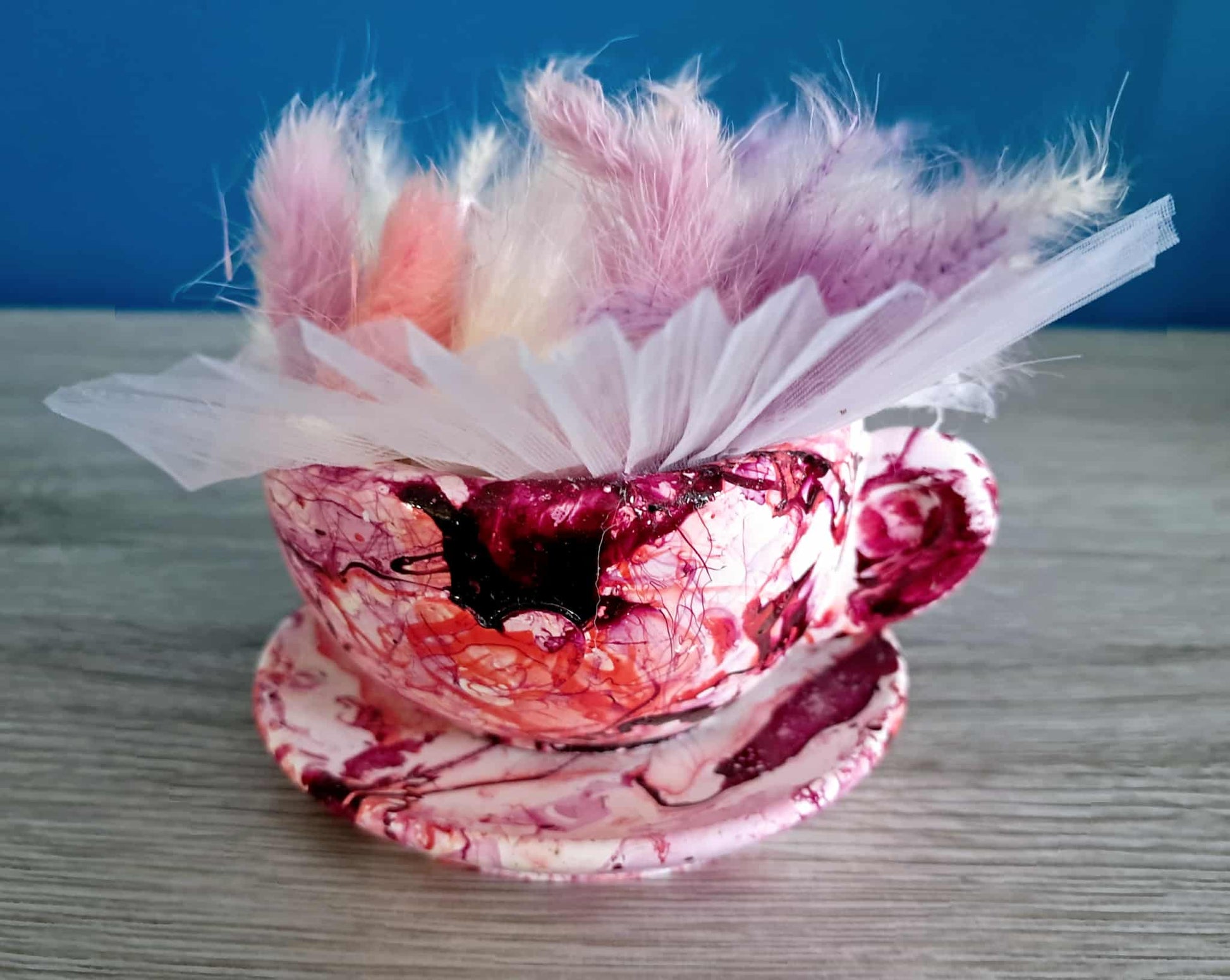 Apportez une touche de douceur et d’élégance à votre intérieur avec ce diffuseur unique. La tasse en porcelaine marbrée rose accueille une délicate fleur ornée de plumes pastel prête à diffuser vos senteurs préférées.