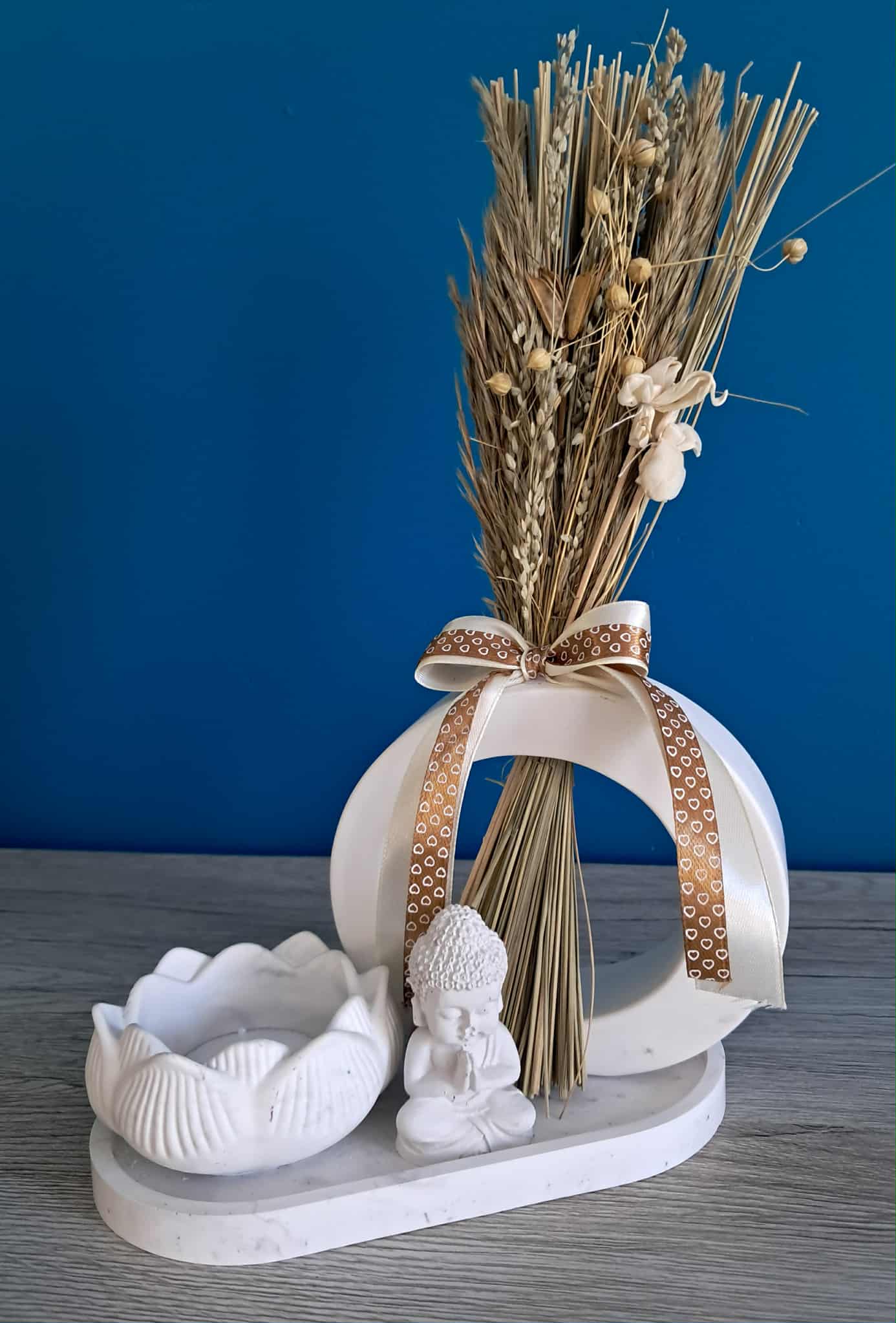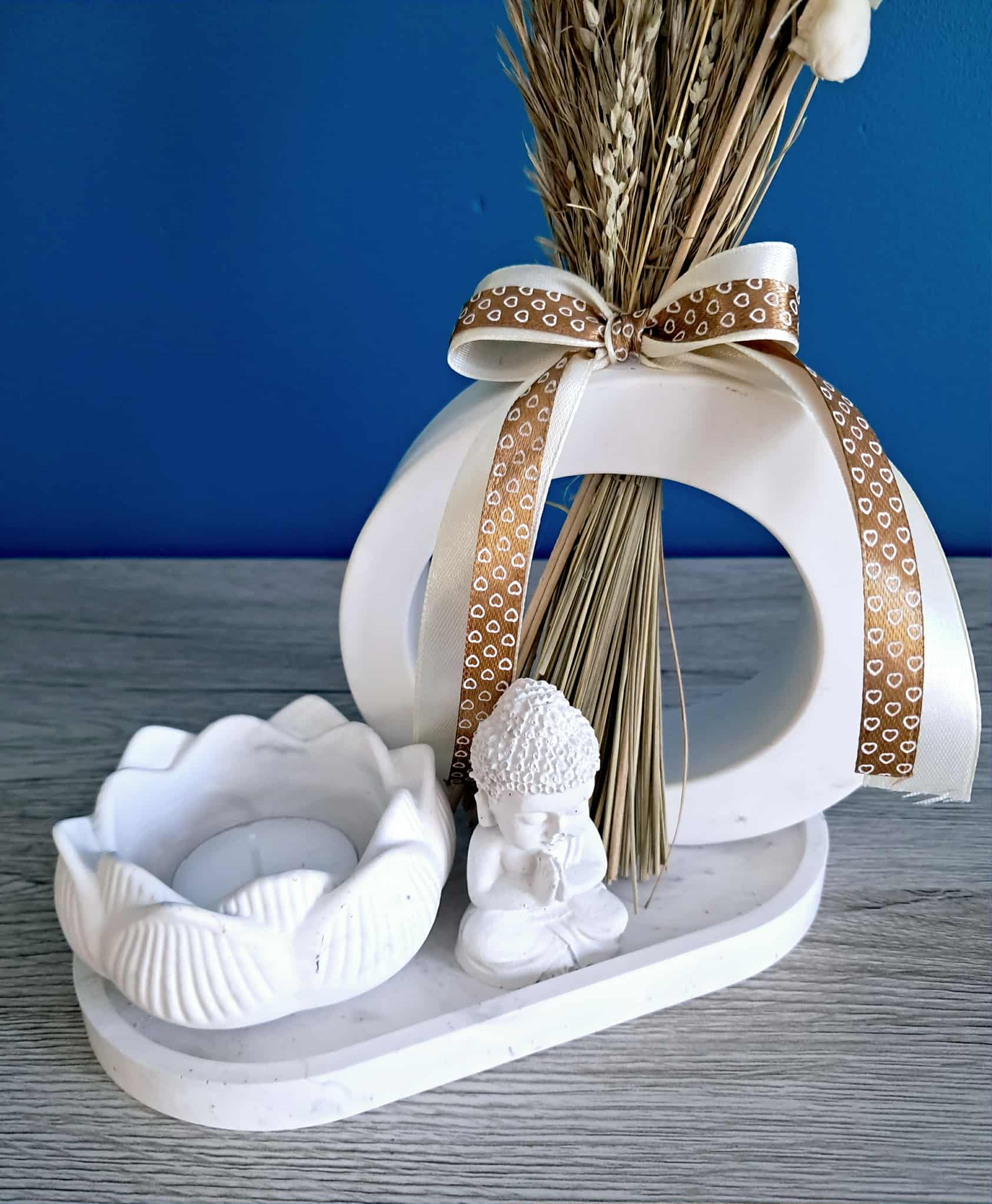 Le petit Bouddha et le photophore en forme de lotus apportent une touche apaisante, idéale pour créer une atmosphère zen dans votre intérieur.