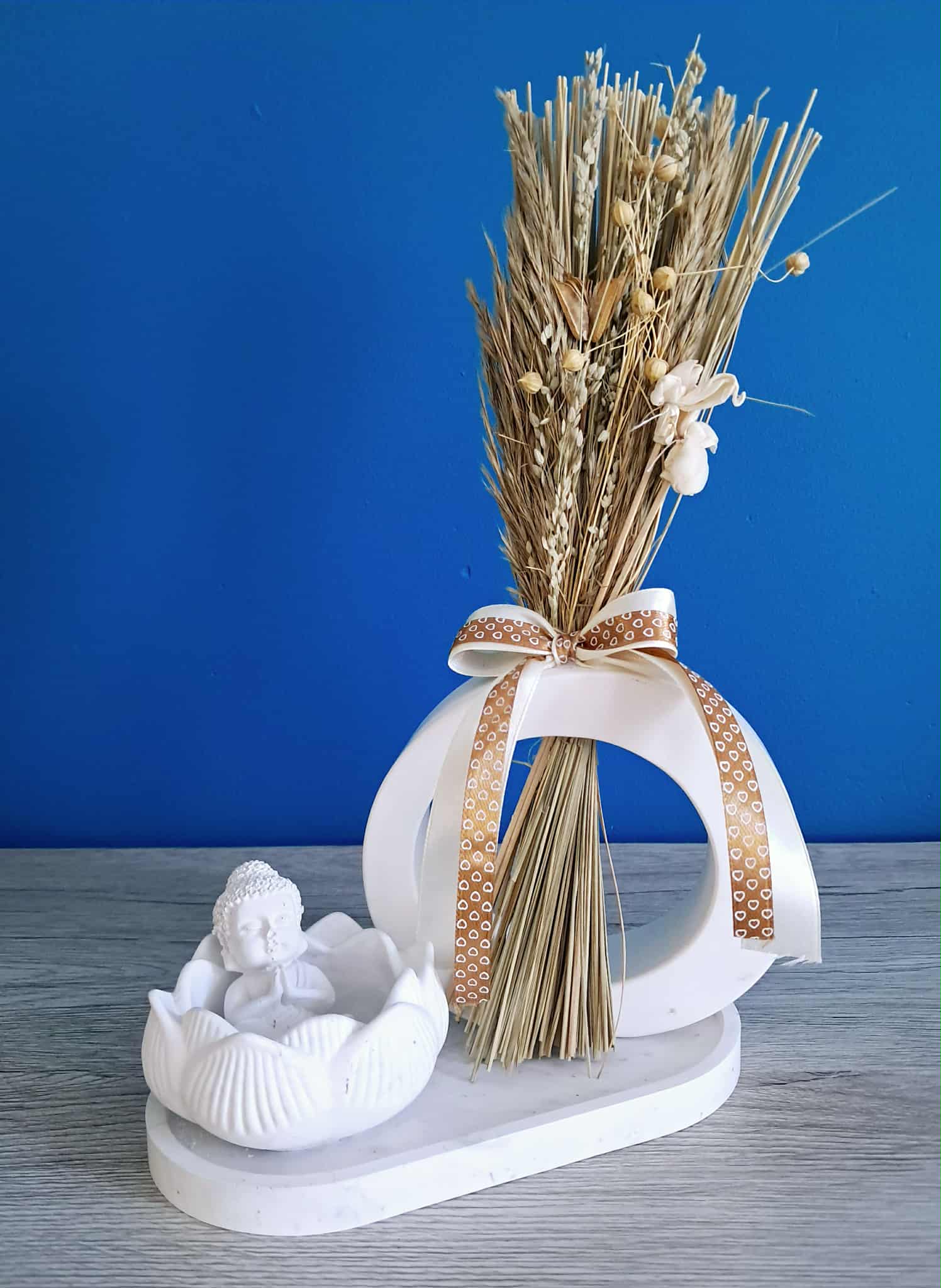 Cette création réalisée par Christine associe l’élégance de la porcelaine blanche à la chaleur d’un bouquet de fleurs séchées.