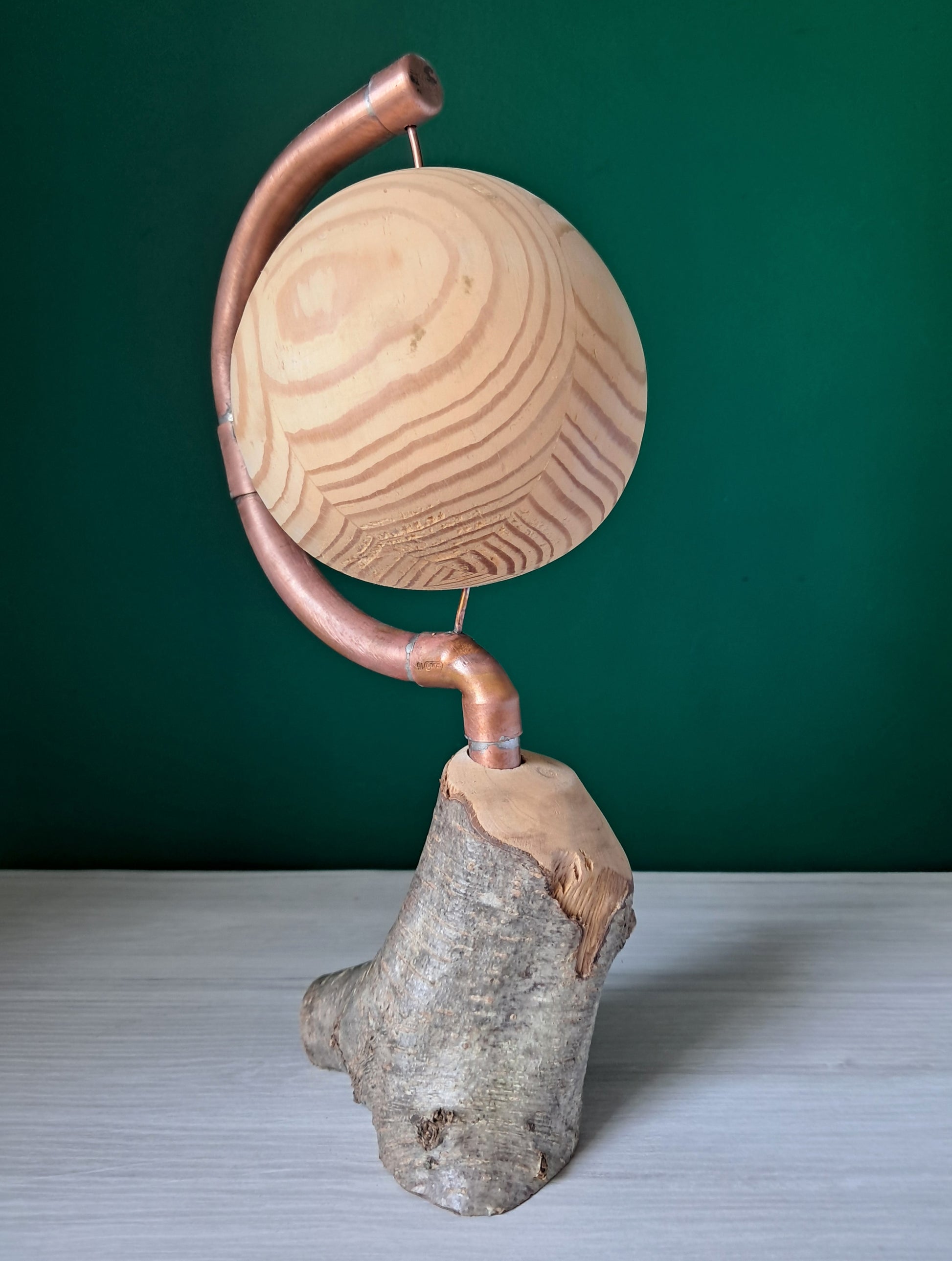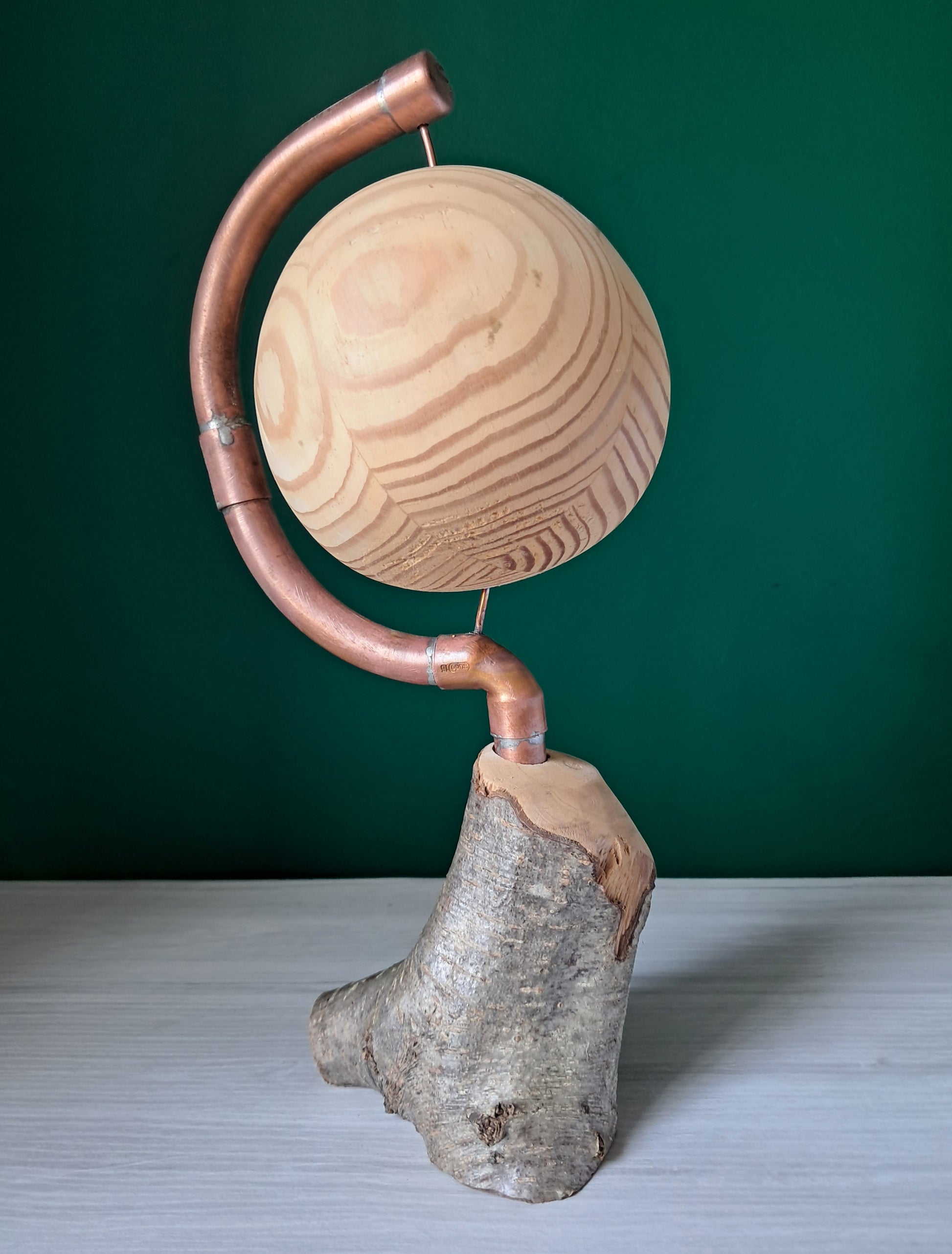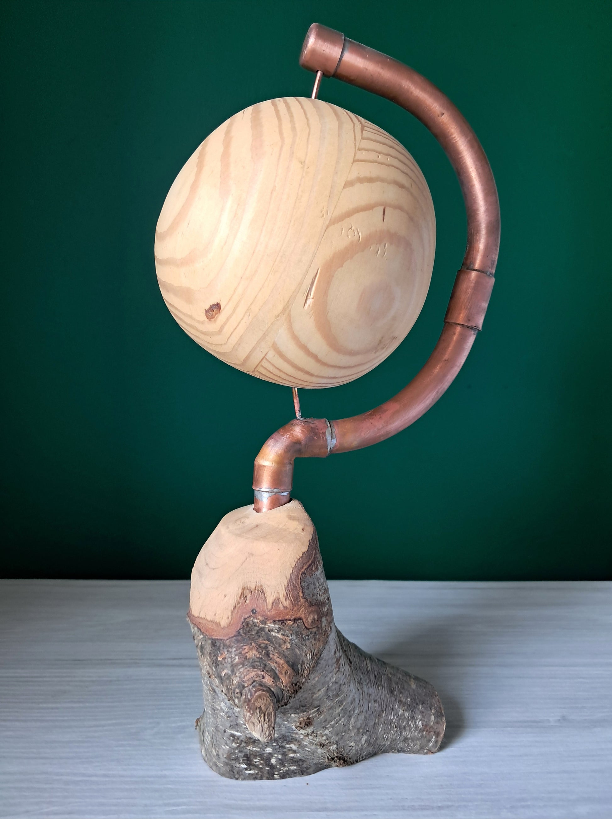 La sphère terrestre est minutieusement tournée dans une essence de bois chaleureuse, posée sur un pied en branche naturelle qui lui confère authenticité et originalité. Le tout est soutenu par une structure élégante en métal pour une alliance parfaite entre la nature brute et le design raffiné.